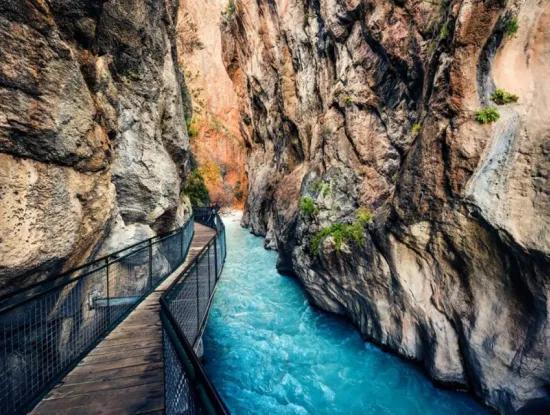 Über den steilen Klippen des Flusses befinden sich die verwitterten Fassaden der aus Felsen geschnittenen lykischen Gräber, etwa 400 n. Chr. Die Ruinen der antiken Handelsstadt Kaunos sind eine kurze Bootsfahrt über den Fluss.